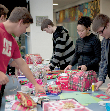 Students at Archbishop Jordan Catholic High School, Sherwood Park, wrap Christmas hampers for local families.
