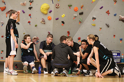 Judges’ comments: Players from S. Bruce Smith School, Edmonton, take a timeout during a basketball game at Parkview School, Edmonton. Coach Tim Reilly (back to the camera) briefs his players. Gerke’s photo reveals one of those moments when students’ attention is held by the teacher. The eclectic assemblage of colourful climbing wall hand grips adds an almost whimsical quality to a serious moment.