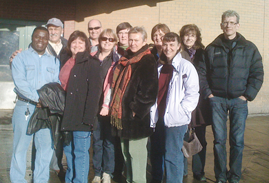 Members of Calgary Public Teachers Local No. 38 were on hand to receive thanks and a commemorative plaque from Lesley Baker, labour strategist with Calgary’s United Way. At the local’s request, its United Way donation was earmarked for the Calgary Drop In Centre. Local President Jenny Regal (second from left) was singled out by the United Way for her personal contributions to the charitable organization