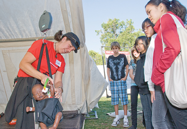 Dr. Isabelle Chotard, a volunteer with Doctors Without Borders/Médecins Sans Frontières (MSF), explains to students how she gauges and treats malnutrition in children in refugee camps. Dr. Chotard’s demonstration was part of "Refugee Camp in the Heart of the City," a reconstruction of a refugee camp, displayed in Edmonton and Calgary this September. The exhibit featured materials used by MSF in its emergency medical work around the world, including emergency refugee housing, a food distribution tent, a water pump, a health clinic, a vaccination tent, a therapeutic feeding centre and a cholera treatment centre.