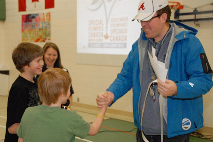 With those words of encouragement, Grade 5 student Aidan Hunt shared a firm and sincere handshake with 33-year-old Special Olympics athlete Larry Green. Students attending the assembly at Albert Lacombe Catholic Elementary School, in St. Albert, cheered and clapped boisterously in support of Green, who will compete in the alpine skiing event at the 2012 Special Olympics Canada Winter Games.
