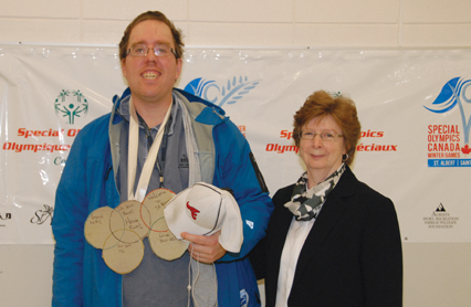 Pat Herlick (right) taught Special Olympics athlete Larry Green when Green attended Albert Lacombe Catholic Elementary School, in St. Albert. Herlick introduced Green to a school assembly held in early February. After Green addressed the assembly, Grade 5 students Josh Parenteau (inset, left) and Aidan Hunt presented Green with a special gold medal in recognition of his achievements that earned him a spot on Team Alberta’s alpine skiing team.