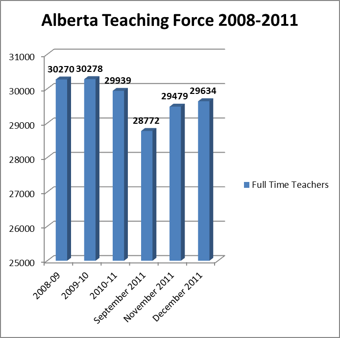 A full board-by-board breakdown of teacher counts from 2008/09 through to November 2011 can be found on the Association website (www.teachers.ab.ca) under “School boards have yet to restore funding.” The teacher counts released in December do not account for all local contextual variables, including the possibility of decreased enrolment in some school jurisdictions.