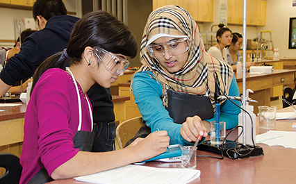 Students of Colbie Bell, a science teacher at McNally High School, in Edmonton, learn about the effect of acid rain on the water system. Students test the acidity of distilled water, lake water and ocean water and compare their results. The experiment is part of the ecology unit in Biology 20.
